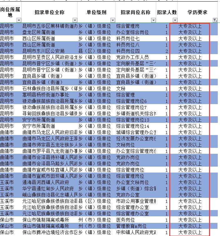 2020年云南公務(wù)員考試職位表尚未發(fā)布,具體招考情況尚不明朗??忌商崆皡⒖?span style="color:#003399;">2019年云南公務(wù)員考試職位表。職位表“學(xué)歷要求”一欄,要求“大專及以上”的職位大專學(xué)歷考生可以報(bào)考。