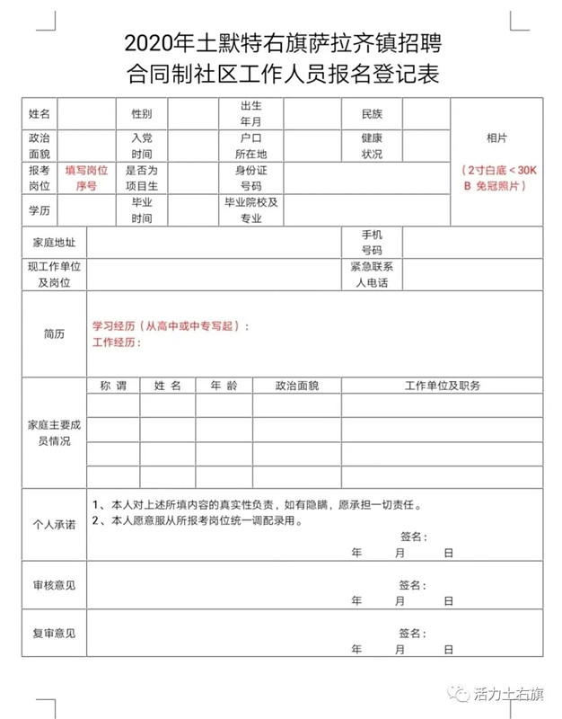 (一)報名及資格審查1、報名時間:2020年6月3日-5日上午8:30-12:00,下午2:30-5:00。2、報名地點:土右旗薩拉齊鎮(zhèn)民生大樓西側(cè)附樓一樓。3、報名人員需認(rèn)真閱讀招聘公告和招聘崗位表,仔細(xì)鑒別個人是否符合報考條件。報名時,報考人員需攜帶《2020年土默特右旗薩拉齊鎮(zhèn)招聘合同制社區(qū)工作人員報名登記表》紙質(zhì)版和電子版各1份(報名表見附件2)、個人畢業(yè)證書原件及復(fù)印件1份、學(xué)信網(wǎng)學(xué)歷證明1份、戶口本、身份證原件及復(fù)印件1份、近期2寸白底小于30KB免冠照片電子版到指定地點進行現(xiàn)場報名(配偶是土默特右旗戶籍的需提供結(jié)婚證和配偶的戶口本原件及復(fù)印件1份,報考崗位2的項目人員需提供服務(wù)期滿相關(guān)服務(wù)證書原件及復(fù)印件1份)。同時,報名工作小組現(xiàn)場審核應(yīng)聘人員報名資格條件,報考人員將對提交材料的真實性、準(zhǔn)確性、完整性、有效性負(fù)責(zé),凡因所提交材料不真實、不準(zhǔn)確、不完整而影響報名、考試或聘用的,責(zé)任自負(fù)(報名時所留電話號碼在招考期間必須暢通,電話號碼無法接通或所留號碼錯誤而影響本人聘用的,責(zé)任自負(fù))。崗位招聘計劃數(shù)與報考人數(shù)比例達到1:3方可開考,如未達到1:3比例,根據(jù)報名情況將對招聘崗位和人數(shù)進行調(diào)整或核減。