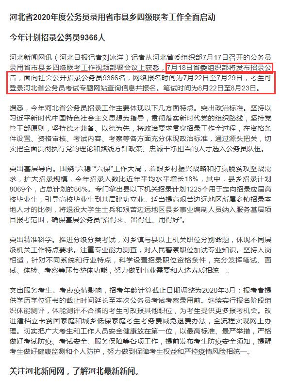 2020年河北公務(wù)員考試公告、2020年河北公務(wù)員考試職位表發(fā)布,今年面向社會公開招錄公務(wù)員9366名,網(wǎng)絡(luò)報名時間為7月22日至7月29日,筆試時間為8月22日至8月23日,參加8.22多省聯(lián)考。詳情如下: