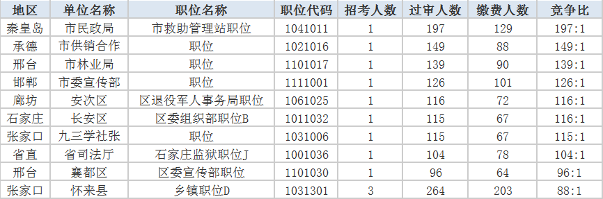 截止到26日18時,競爭比最高的職位為秦皇島市民政局下的市救助管理站職位,招錄1人,審核通過人數(shù)為197人,競爭比為197:1。