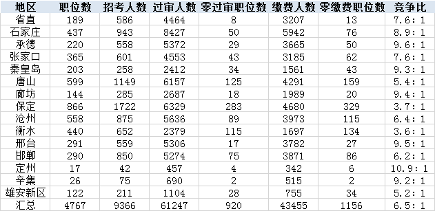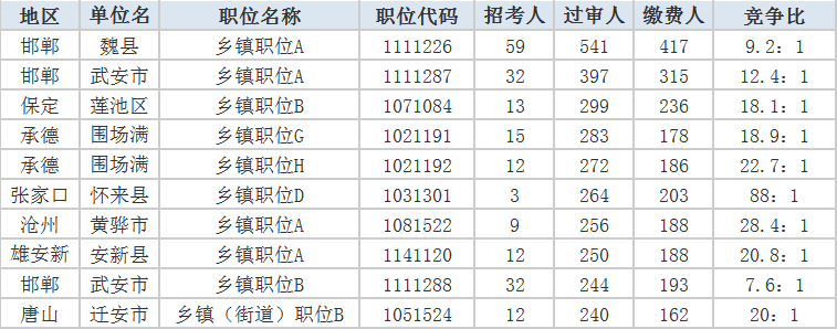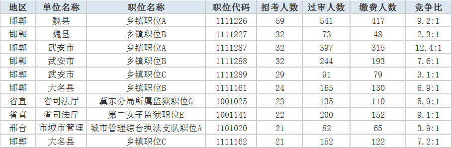 截止到26日18時,報考人數(shù)最多的職位中邯鄲魏縣鄉(xiāng)鎮(zhèn)職位A,招錄59人,過審人數(shù)為541人,繳費人數(shù)417人,競爭比為9.2:1。