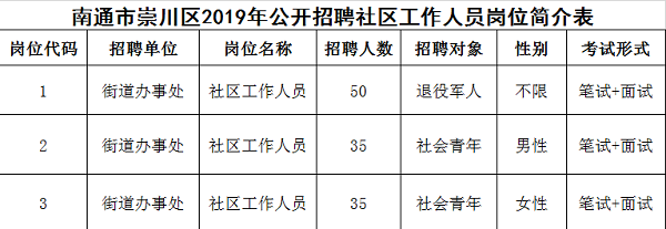 7.具體招聘單位、招聘崗位、招聘人數(shù)及其他資格條件詳見《南通市崇川區(qū)2019年公開招聘社區(qū)工作人員崗位簡介表》(附件1);