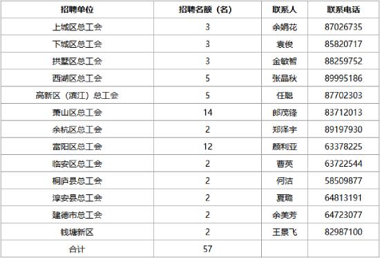 根據(jù)工會(huì)工作需要,今年我市共招聘社會(huì)化職業(yè)化工會(huì)工作者57名,具體招聘單位和名額如下: