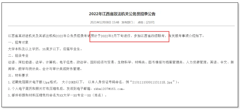 1、近日,同濟大學學生就業(yè)指導中心官網(wǎng)發(fā)布消息:江西省某政法機關(guān)及其派出機構(gòu)2022年公務(wù)員招錄考試預(yù)計于2022年3月下旬進行,參加江西省四級聯(lián)考。詳情如下: