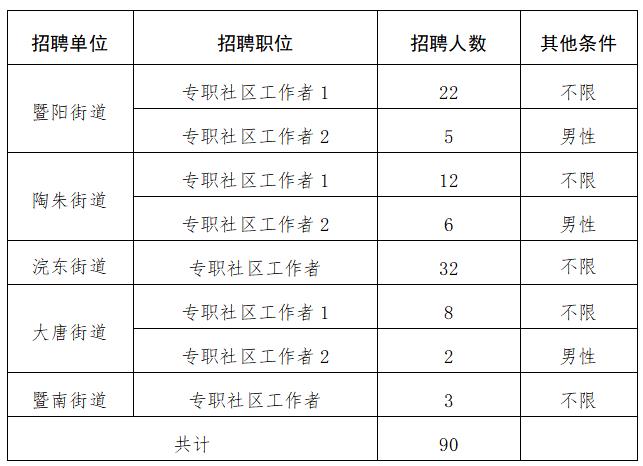 本次招聘擬招專(zhuān)職社區(qū)工作者共100名。其中高層次社區(qū)工作專(zhuān)業(yè)人才10名(暨陽(yáng)街道4名,陶朱街道、浣東街道各2名,大唐街道、暨南街道各1名),其他專(zhuān)職社區(qū)工作者90名(詳見(jiàn)下表)。